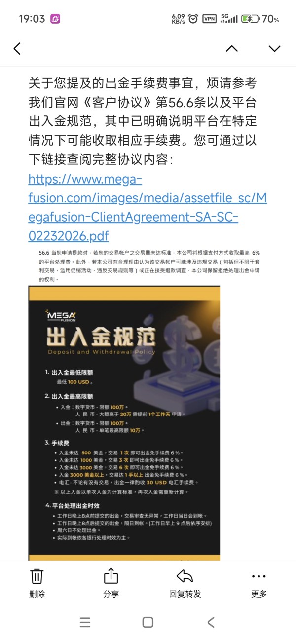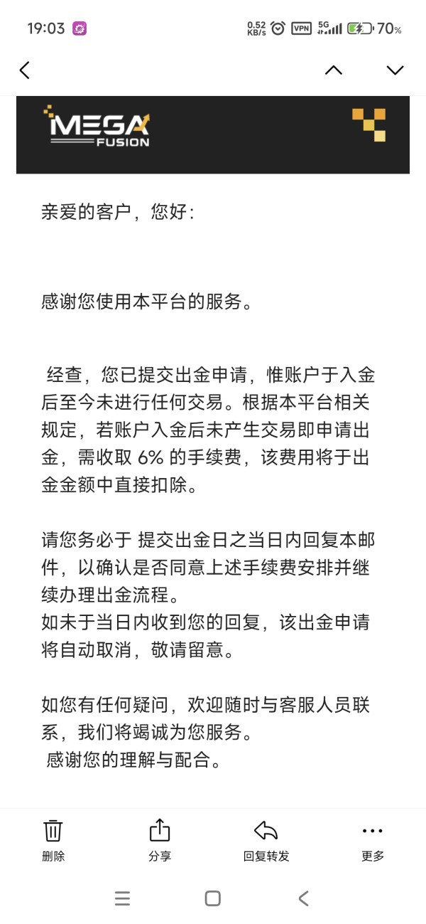 入金后,没有交易,出金要扣6%费用 提交出金长时间,没有人处理,一直在审核状态。