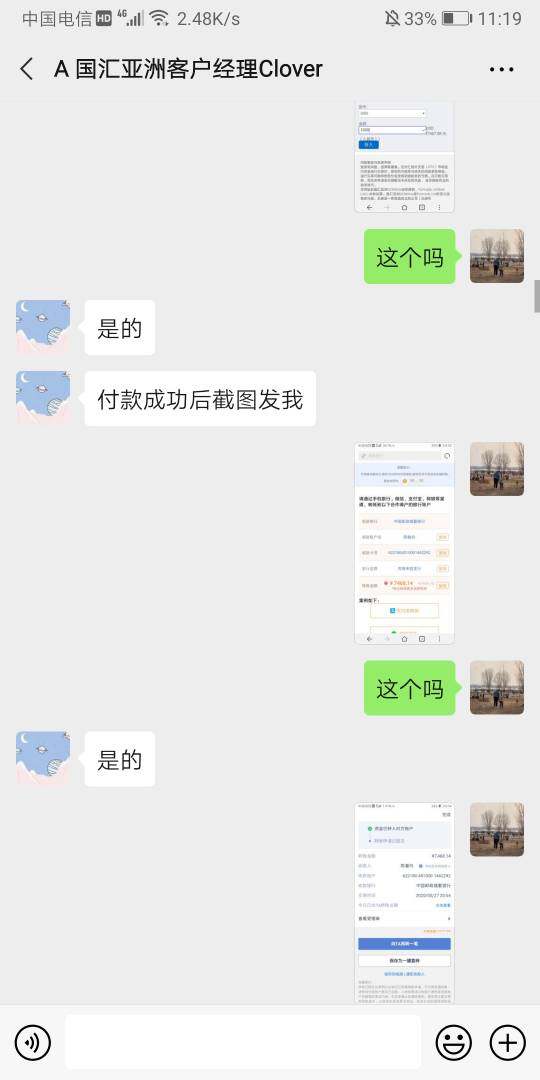 第一 入金的时候一千美金转给个人了7468。当天火币网USDT 7.05元。汇率太高。 第二 我是新手 有个专门的人加我,说是我的分析师,让我买黄金上涨,已经狂跌了,我问是否止损,他说没事,导致第二天爆仓。看他们发的朋友圈都是 跟着分析师赚钱的记录什么的。太黑了