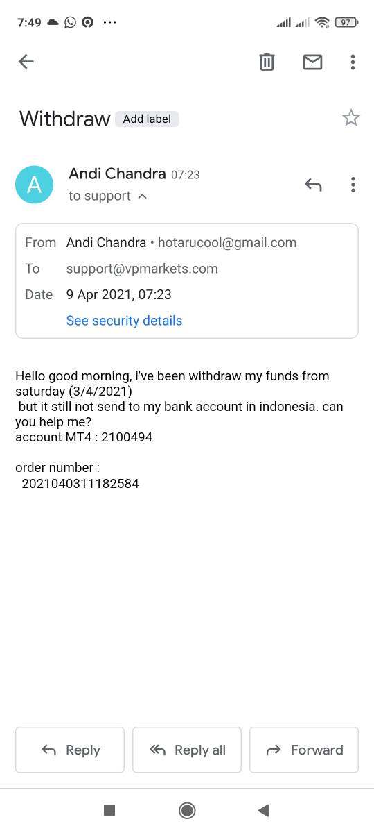 i've been withdraw my funds from saturday (3/4/2021) about $733 via wire but it still not send to my bank account in indonesia. i cant chat online with the CS and I've send an email to support service and other email but still no response. account MT4 : 2100494 order number : 2021040311182584