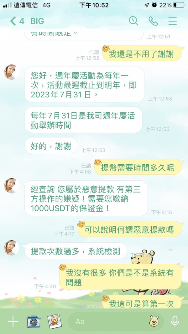 無法提幣客服說電腦顯示出惡意提幣異常需繳保證金第二次入金賺了要全部提幣就異常 我才領一次呢 跟客服說結果已讀不回了 幫幫我!雖然不是很多但是對我來說是很多的 辛苦的血汗錢