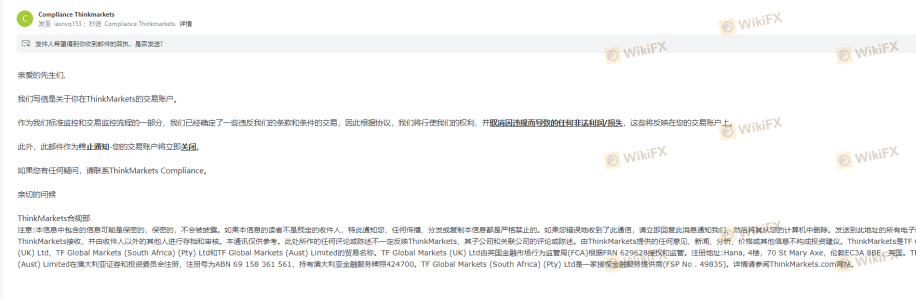 今年の4月から5月にかけて、私は30,000ドルを預け入れました。2025年6月10日、一方的な市場の動きにより、私の口座は利益を生み出しました。その後間もなく、ThinkMarketsプラットフォームから違法行為を行ったとしてメールが届き、口座残高を調整し、口座を閉鎖すると通知されました!彼らは私の利益43,685ドル全額を没収しただけでなく、元本の30,000ドルの引き出し要求も3ヶ月間無視されています!この3ヶ月間、私はThinkMarketsに何度も連絡し、元本と利益の返還を要求しましたが、プラットフォームは完全に無視し、一切の返答がありませんでした!規制当局に苦情を申し立てさえしましたが、彼らは詐欺プラットフォームで、正当な監督の対象外です。皆さん、どうかこのプラットフォームから遠ざかってください。 プラットフォーム!!!