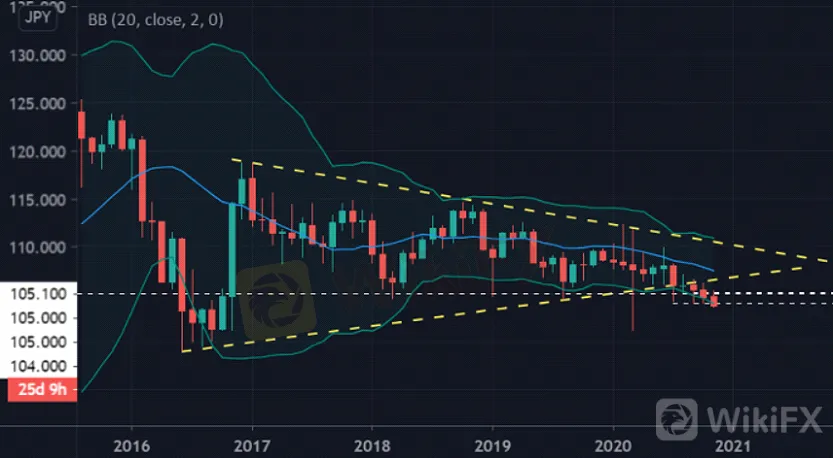 米ドル/円チャートによると、為替レートが過去3か月間のサポートラインである104を下回ったことを示しており、市場では下落を加速させる可能性があるとみられてます。