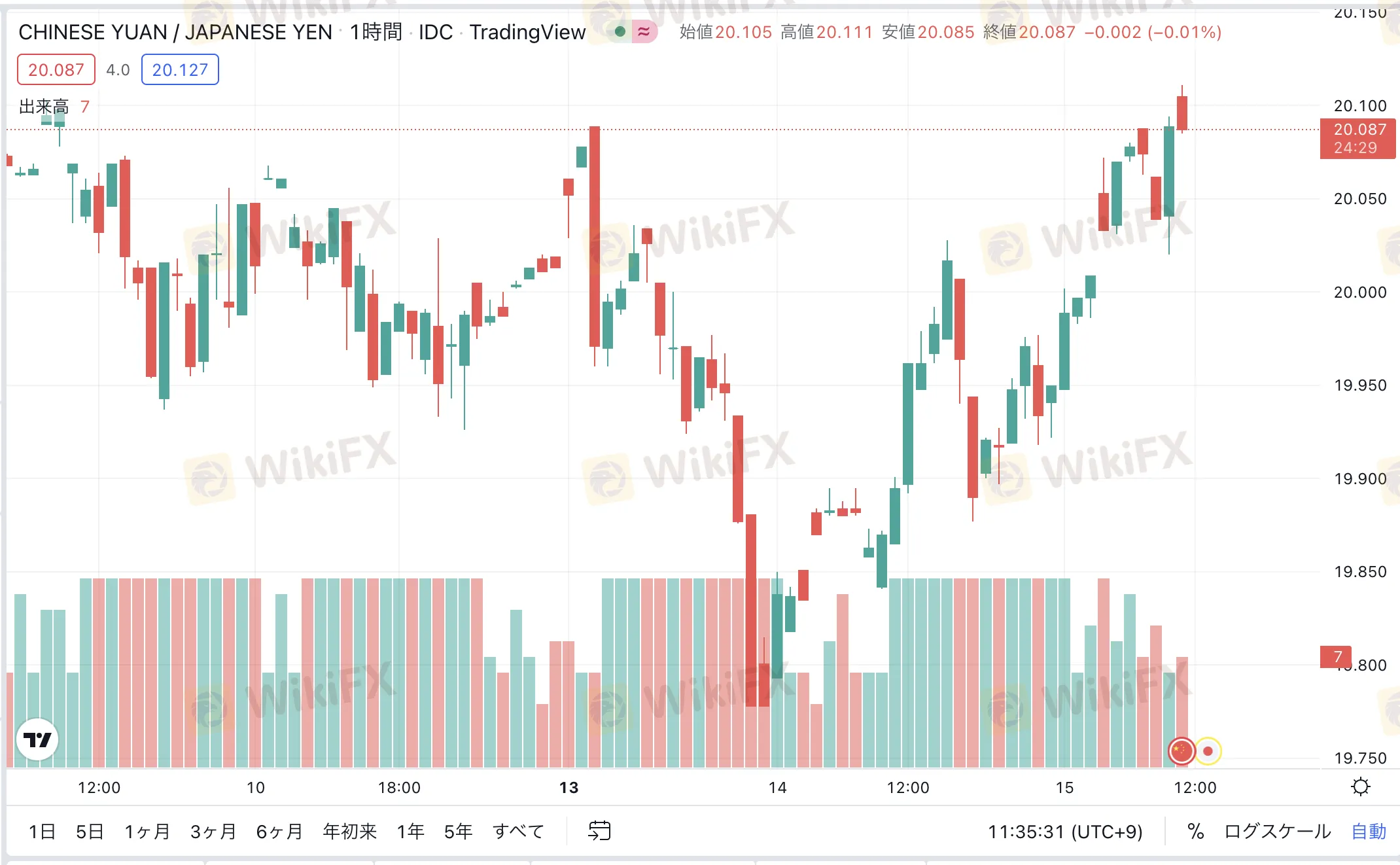中国の小売売上高(前年比)が11:00に発表され、市場予想のマイナス7.1%に対しマイナス6.7%となり、前回値のマイナス11.1%から改善しました。同じく中国の鉱工業生産(前年比)も発表され、前回のマイナス2.9%から上向きとなり、プラス0.7%で着地しました。良好な中国経済の状況が反映され、指標発表直後から人民元円は20.131まで上昇しています。