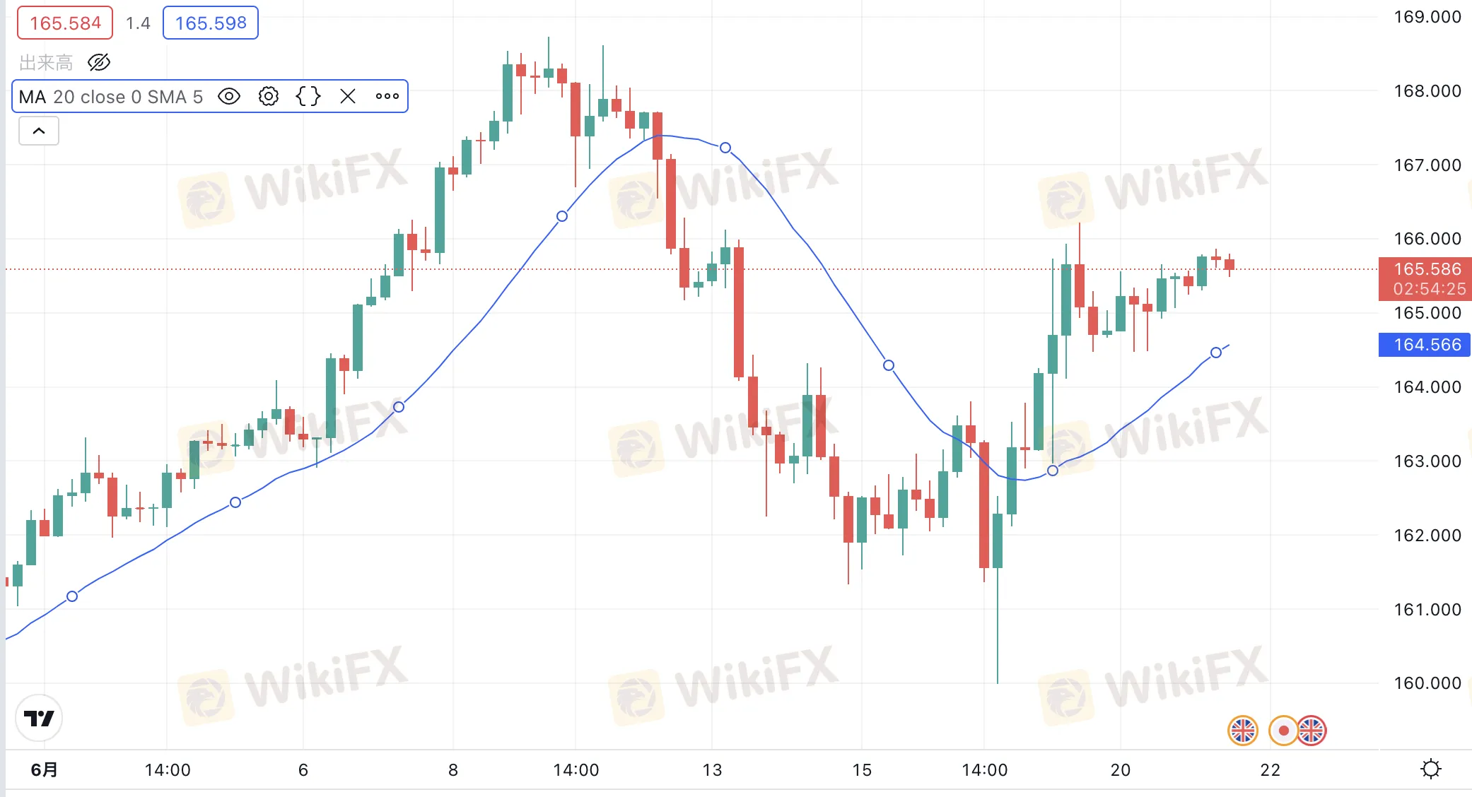 結果を受け、小幅上昇していたポンド円は反落し、165.594まで下落しました。テクニカル的には、ポンド円は下落しているながらも時間足20MAより上に位置しており、RSIも70に到達せずバッファを残しての値動きとなっています。