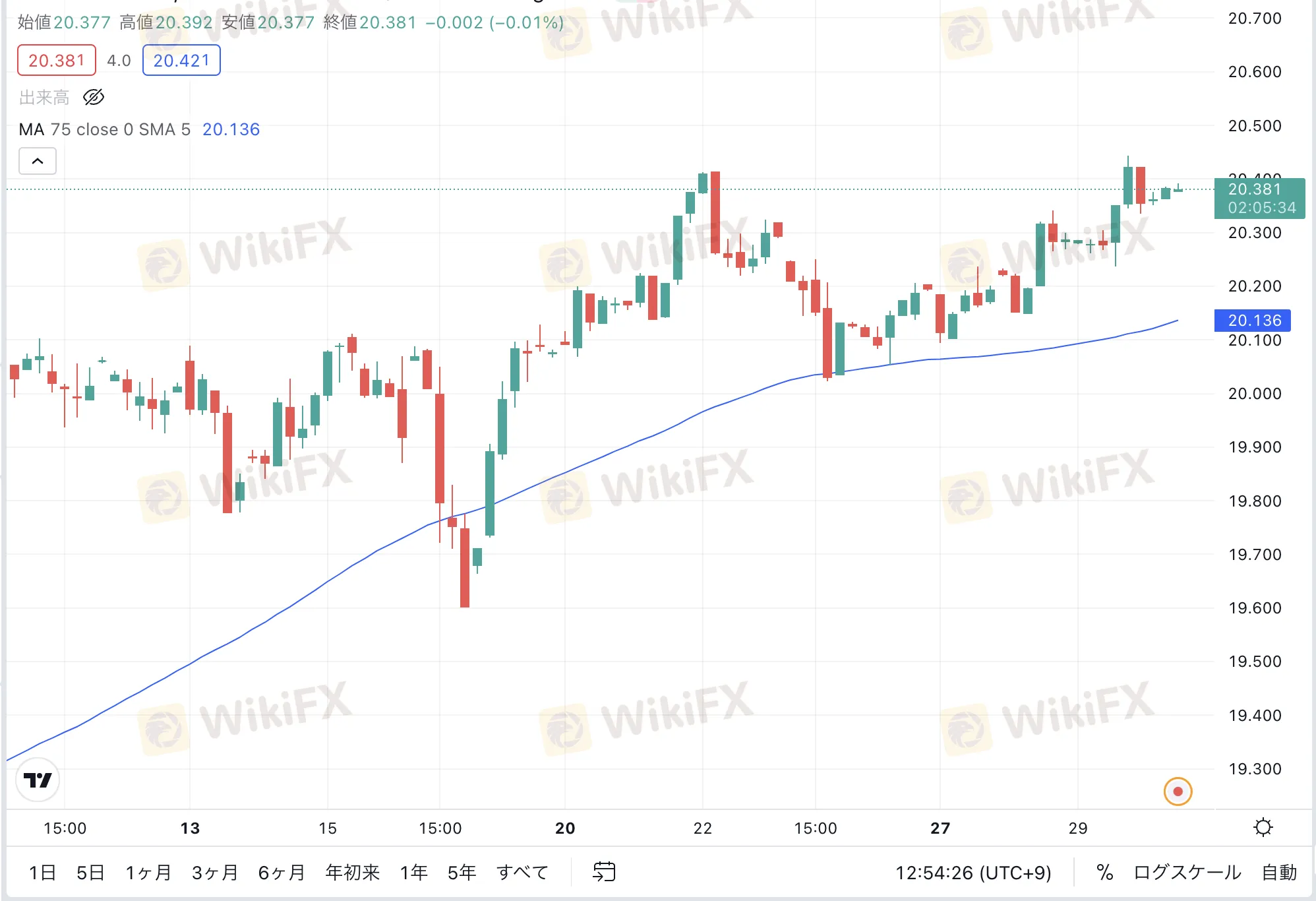 上昇が継続した場合、チャネル上限の20.539を目途とし、下落が入った場合は、4時間足75MAの20.165をロスカットラインとして見ることができそうです。
