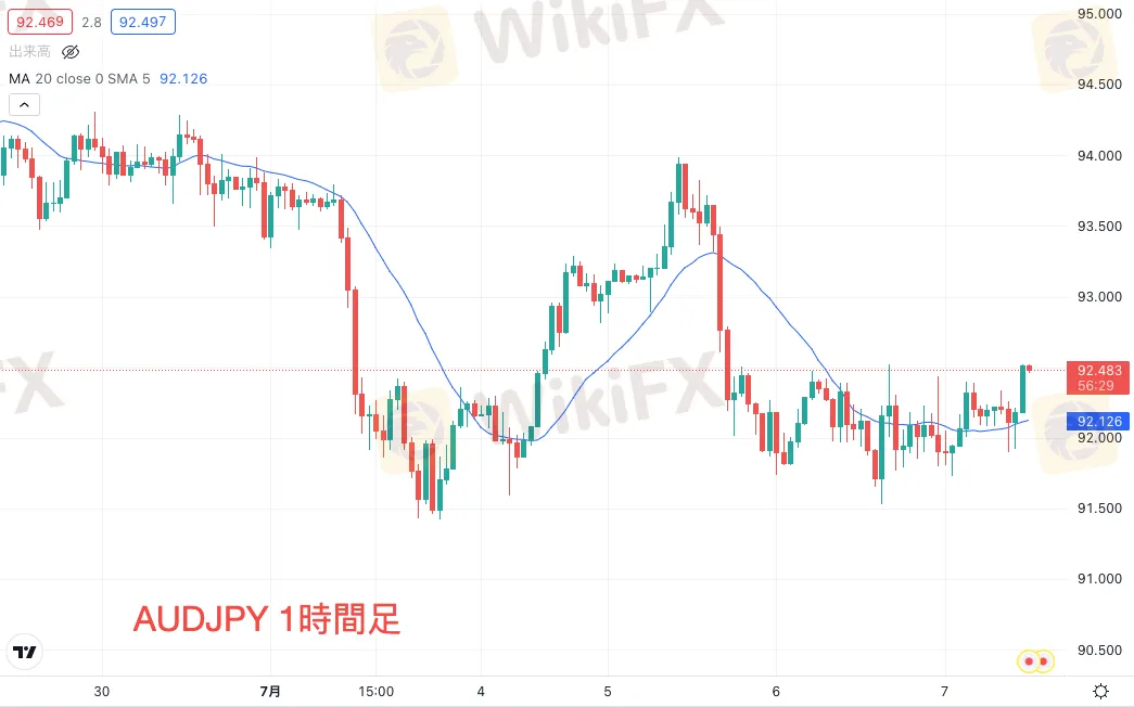 貿易収支の結果を受け、豪ドルは下落から一転、上値を追う姿勢を見せています。昨日91.527-92.519でのレンジ推移となっていた豪ドル円は、本日も昨日のレンジ内に位置しているものの、下落から上値追いにシフトしています。現在は92.270付近で推移しており、時間足20MAの真上で方向感を模索する値動きです。