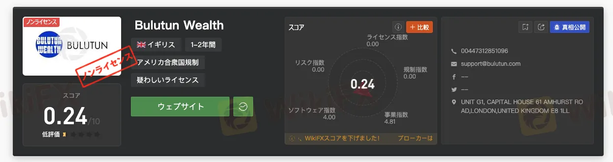 WikiFXのディラーページから確認でき、Bulutun Wealthは金融ライセンスを保有していなく、スコアが低いので、利用することがおすすめしません。