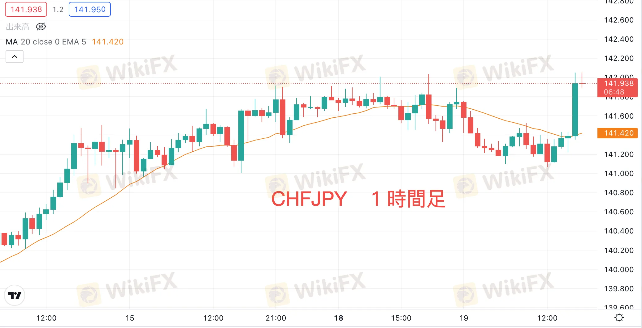 貿易収支の発表後、スイスフランは対円・対米ドルともに上昇しました。フラン円は本日安値の141.067から141.403まで上昇。米ドル円が下落する中での上昇となっています。
