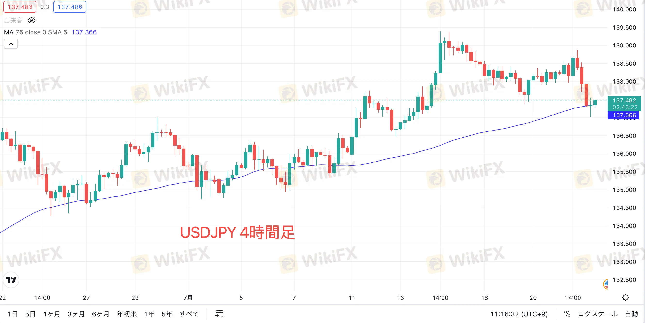 本日のアジア時間序盤では、米ドル円は137.221付近で推移しています。昨日高値の138.876から160pipsほど下落しており、4時間足75MAを下抜けた位置にいるため、さらなる下伸に警戒が必要です。