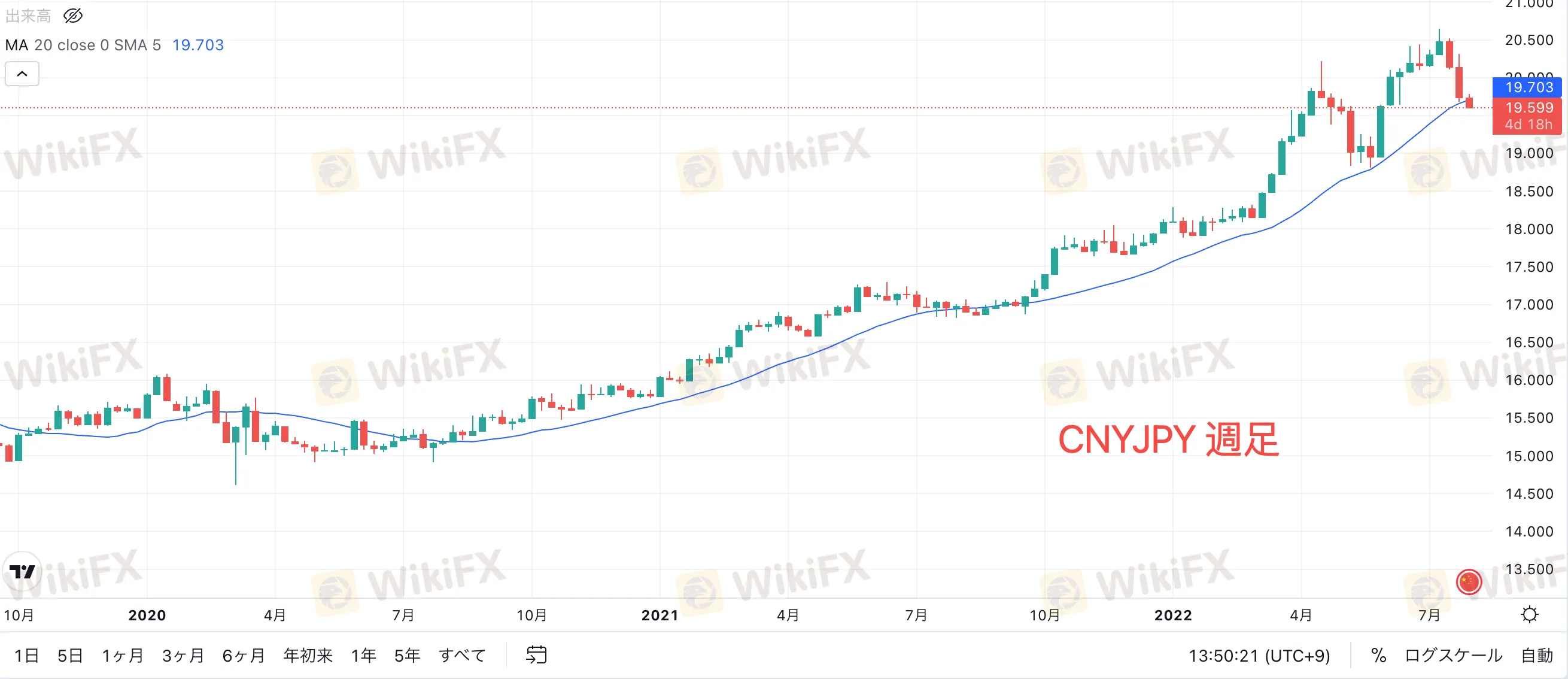 7月14日の20.631を直近高値とし、上昇フラッグの下限を目指して下落しています。このまま下落が継続した場合、フラッグ下限で日足200MAに重なる19.002付近まで値が落ちるのか注視したいところです。