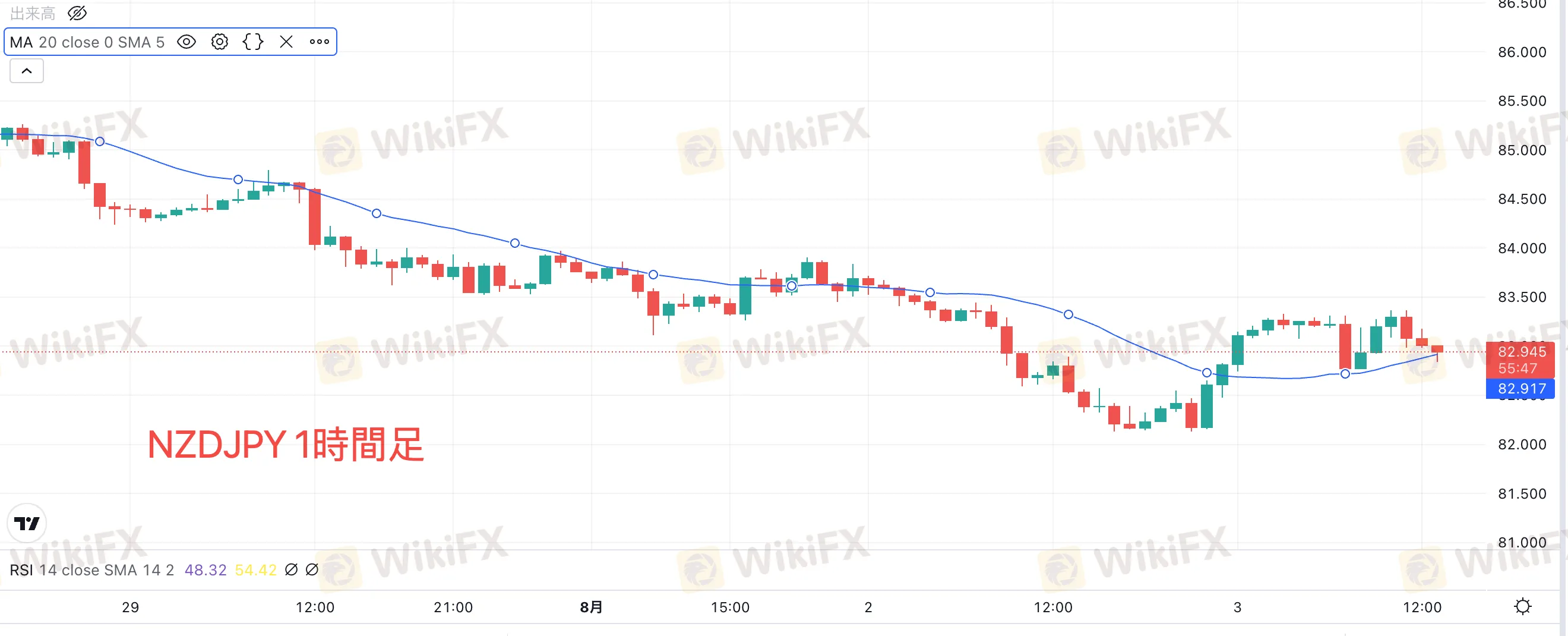 NZドル円は、昨日高値の83.476から82.750まで約70pipsほど下落。雇用統計の結果が市場予想を下回ったことから、上値が重くなっています。テクニカル的には、NZドル円は時間足20MAにタッチすると同時に下落しているため、下値更新をするのか慎重に判断しましょう。