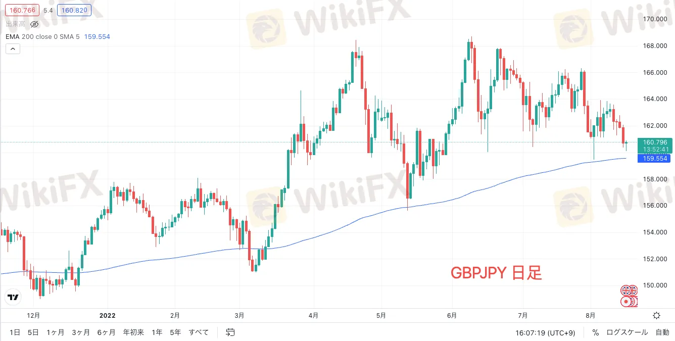 ポンド円はユーロ円よりも下値が緩い状態で、現在は160.800付近で推移しています。テクニカル的には、日足ペナントの下限を下抜けましたが、200EMAには届いておらず、日足以上の上位足では下落を留まっているようにも見えます。