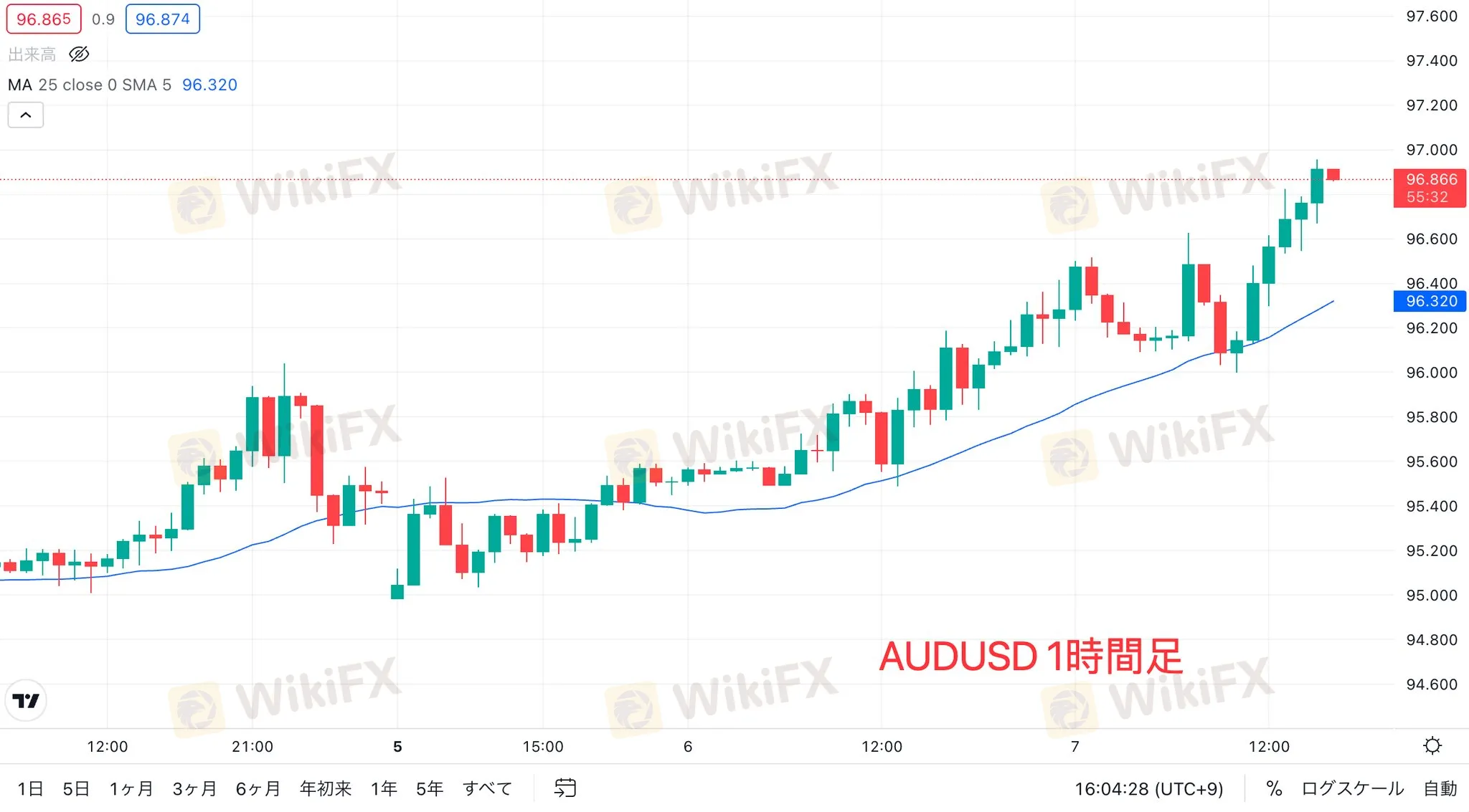 GDPの結果を受け、対円で下落していた豪ドル円は反発しました。本日のアジア時間で96.633まで上昇していた豪ドル円は軟調な展開となり、96.000まで反落していましたが、指標発表により小幅に回復。現在は96.182付近での推移となっています。