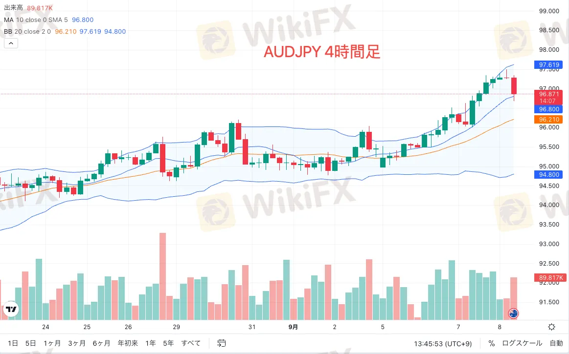 ロウRBA総裁のスピーチが開始されると、豪ドルは急落。欧州通貨を中心に他のクロス円が下げ渋る中、豪ドル円は97.496から96.784まで60pips以上急落しました。豪ドル円は4時間足のボリンジャーバンド+2σから10MAまで急落しており、さらに下伸し20MAを下抜けると、下落が加速する可能性があります。