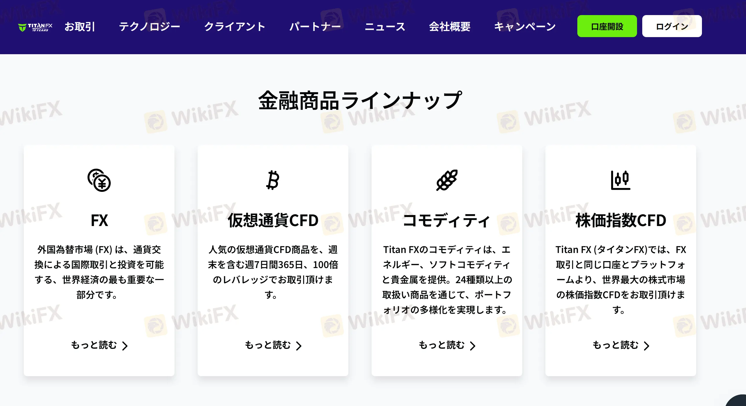 Titan FXは、外貨、商品、株価指数、暗号通貨に対応しており、投資家に多様な取引機会を提供していますが、債券、オプション、ETFには対応していません。