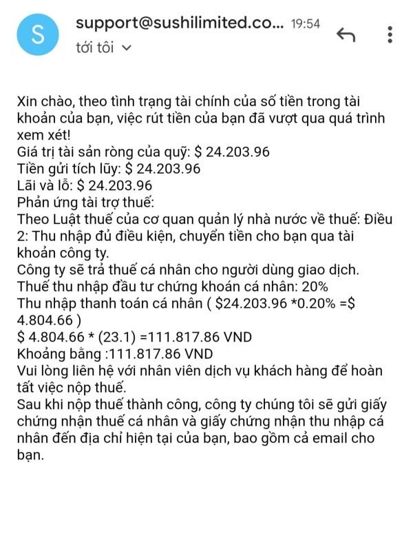 mình có giao dịch trên sàn Sushi global investing trên MT5 , sau khi liên hệ cskh rút tiền thì họ thông báo đóng 20% tiền thuế trên tổng số tiền mình đang có
