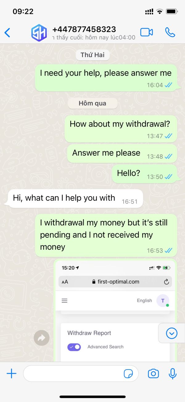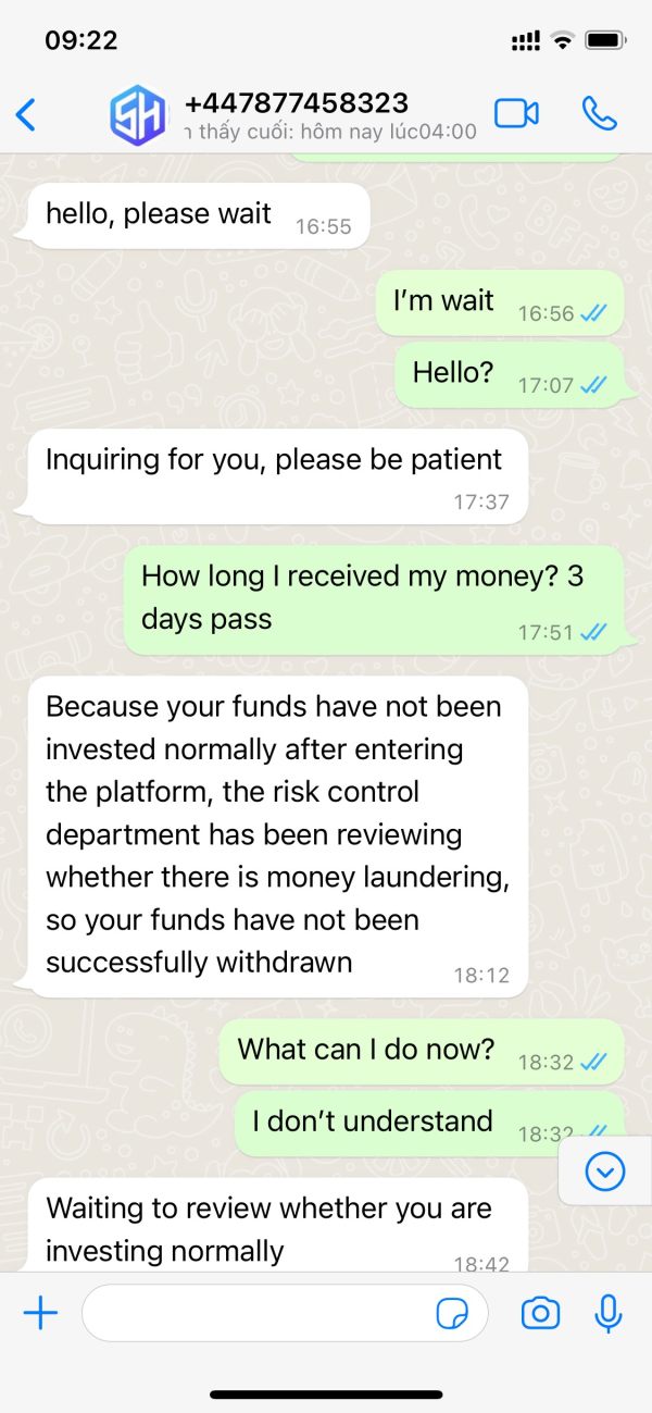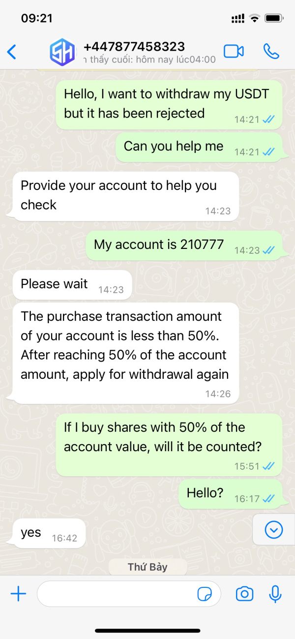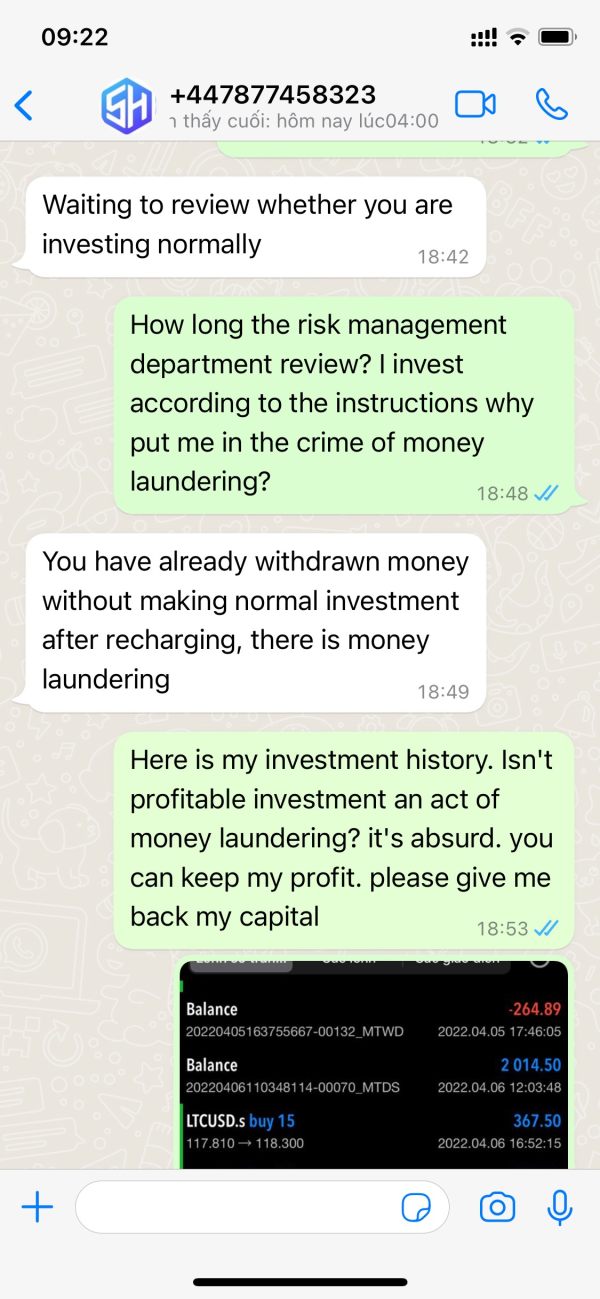 Tôi nạp hơn $2,000 thông qua kênh Binance vào sàn Shenghui để giao dịch ngoại hối qua ứng dụng MT5. sau khi giao dịch tôi thấy có lợi nhuận nên rút về ví Binance lại. nhưng phía Shenghui nhiều lần từ chối cho tôi rút với lý do tôi chưa mua hết 50% vốn. tôi đã làm theo hướng dẫn vào lại MT5 và giao dịch với mức trên 50% vốn và thực hiện lệnh rút 1 lần nữa, lần này sàn Shenghui lấy lý do giao dịch của tôi bị bộ phận giám định rủi ro giữ lại vì có vẻ nó là một hành động rửa tiền. tôi cảm thấy hết sức vô lý! khi giao dịch có lợi nhuận thì nhà đầu tư rút về ví thì bị đánh giá là rửa tiền và giam tiền lại không được giao dịch hoặc rút ra. tôi nhiều lần trao đổi với bộ phận chăm sóc khách hàng, tuy nhiên họ chỉ trả lời rằng vốn của tôi đang bị giám sát và phải đợi phán quyết tự họ xem có rửa tiền hay không. đến nay đã gần 1 tuần trôi qua nhưng bên phía Shenghui vẫn không có thiện chí cho tôi rút tiền của tôi về ví. tôi đính kèm trao đổi của tôi và bộ phận chăm sóc khách hàng theo hình bên dưới. hình cuối là lịch sử giao dịch của tôi