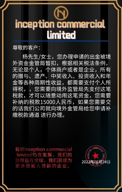 任何人不论是投资,做生意,上班,所得的所有正当来源的资金收入,都是需要缴纳个人所得税,平时做生意那些应该也知道,还有多少内地以及港星偷税漏税导致被罚,这就是例子。如果说大额资金不明来源,到你银行卡,到时候不是我司麻烦,是你自身麻烦,因为资金来源不明会追究资金来源,如果说境外投资所收入却没有交税,会被定性为非法收入,不仅所有财产会冻结,也会追究司法责任。因为现在你黄金账户里资金都是你个人的,属于你个人私有财产,境外金管局规定,就需要交税 所得收益交税之后你的境外投资个人所有私有财产就可以随意动用分配,金管局也无权再干涉。您好,这次交完之后之后的盈利超过8000美金才会收取,您现在账户内现有资产后续不会缴纳任何税收。纳税完之后可以办理出金业务的,24小时内外汇监管局会汇款至您的银行卡,我们给所有客户兑换美金以及人民币或者全球各个国家的币种都需要经过金管局,所以每一笔资金他们都是很清楚,税收这个是躲不掉的