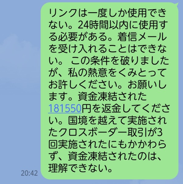 kaiher global ltdのウェブサイトに登録し、kaiherから、27日にメールが届いていたが、気づかず、昨日29日に181550円の資金凍結された返金依頼の返信メールを送信した。