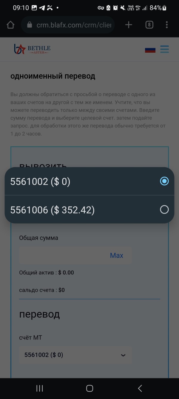 Здравствуйте. Меня зовут Каюмов Ринат Абдулкадырович. Я являюсь инвертором биржи BlaFX. Хочу сделать заявление о невозможном выводе денежных средств с моего торгового счета. В настоящее время на платформе запретили вывод денежных средств. О сложившейся ситуации мною не было получено ни одного уведомления. Служба технической поддержки держит обратную связь и требует немедленного пополнения 50% от депозита на мой аккаунт для разморозки торгового счета. Номер торгового счета: для разморозки торгового счета. Номер торгового счета: 5561006 . В случае не пополнения и не выполнения данных условий аккаунт будет удален 352$ Рассчитываю на ваше вмешательство и скорейшую обратную связь. С Уважением, инвестор платформы Каюмов Р.А.