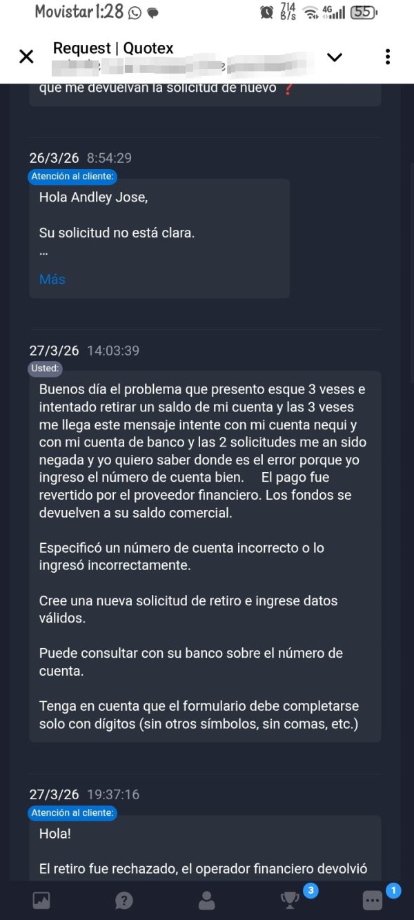 Buenas tardes mi problema es que e intentado retirar mi saldo 6 veces de la plataforma 。