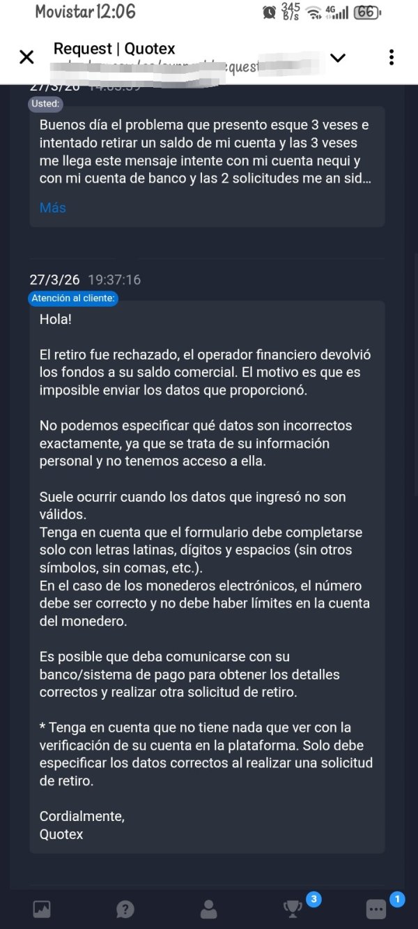 Buenas tardes mi problema es que e intentado retirar mi saldo 6 veces de la plataforma y me devuelve el retiro diciendo que algunos datos no coinciden cuando yo me e asegurado de ingresarlos correctamente y ellos no me dan más solución si no que verifique mis datos porque ellos no saben cual de mis datos es incorrecto y entonces no me dan ninguna solución