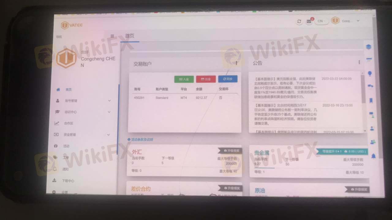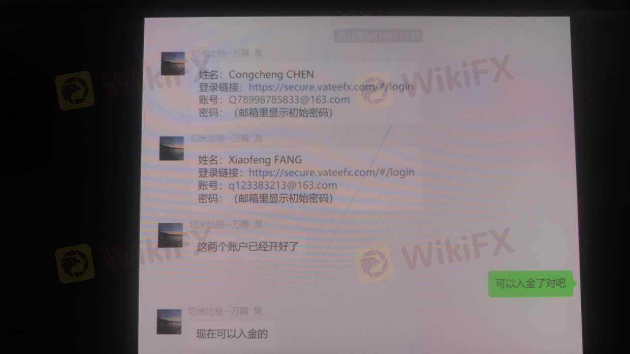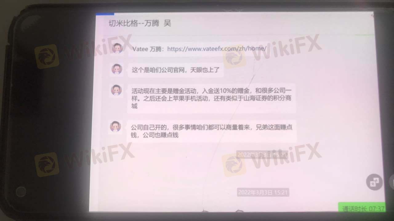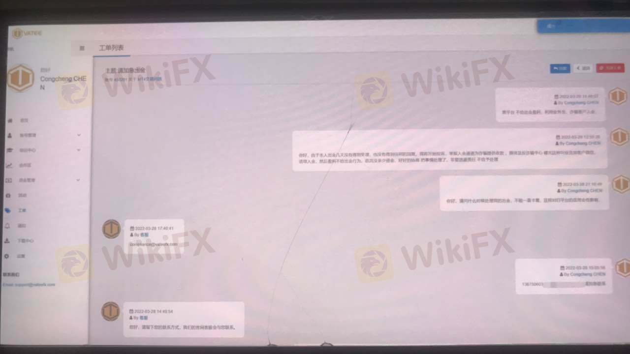 클라이언트는 Vatee 플랫폼 https://www. Vatee fx.com/zh/home/. mt4 거래 계정 450291에서 판매원 - wu hao와 규칙 및 거래 방법을 확인한 후 3 월 16 일에 5000을 입금했습니다. 첫 번째 이익이 인출 된 후 플랫폼이 괜찮다고 느꼈고 나중에 주문을 계속했습니다. 영업 사원은 이익과의 연락이 끊겼습니다. 스퀘어는 거래가 불법이며 계정이 90일 동안 동결됐다고 답했다. 나는 판매원의 채팅 기록을 플랫폼에 이메일로 보냈다. 플랫폼은 이를 무시합니다. 나는 플랫폼이 블랙 플랫폼이라고 불평했다. 나는 판매원을 이용하여 고객을 속여 돈을 입금합니다. 이익이 너무 크면 고객은 철회하지 않고 고객의 손실에서 손실을 입습니다. 이 사기 플랫폼에서 멀리 떨어져 있으십시오.