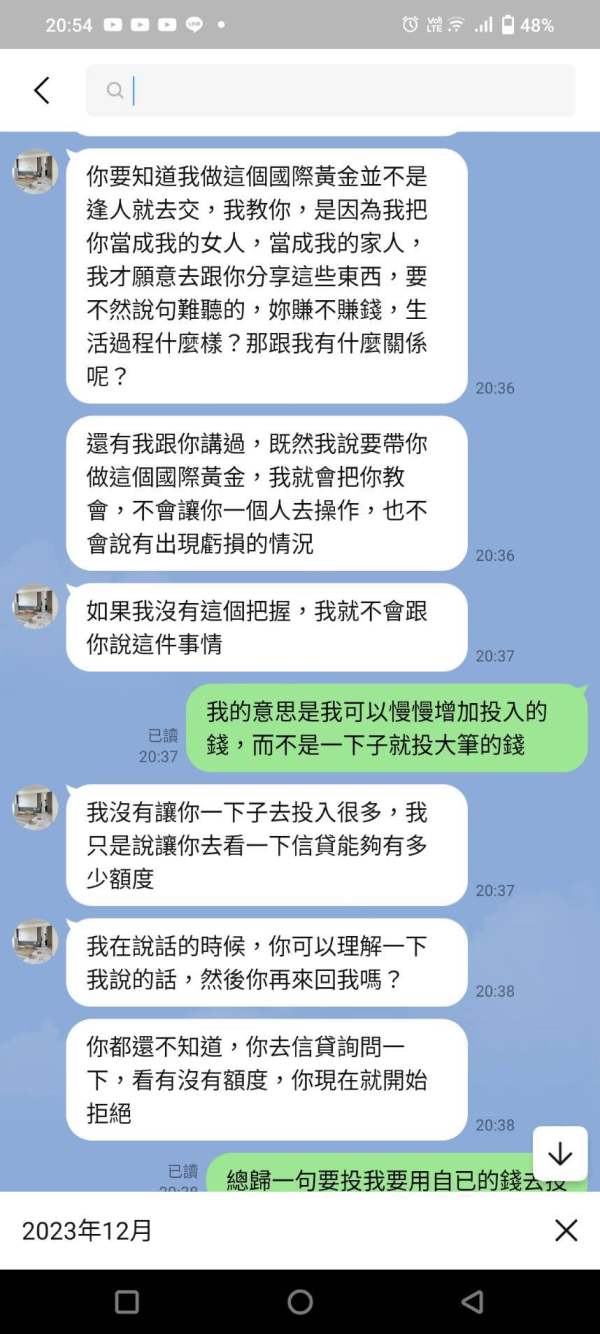 11月份在IG認識,劉世傑、1983年07月26日生,大陸湖南常德巿人,在香港開店內裝橫。 加好友後每天聊天三餐問侯關心、甜言蜜語,也聊到生活狀況,他一直說希望能改義我的生活,並且說女人要有自已的小金庫,他自已就因為疫情所以有被隔離期間是沒有收入的,後來自已就專心的研究國際黃金,也是有所收益,他說會帶我一起做。 第1次投入資金台幣1萬,當下就有收益拿回,第2次投入台幣10萬,當下又賺了台幣1萬的盈餘,就先把盈餘拿回,想說可以留下本金,繼續投資。 後來又說平台年底有建倉活動,要我跟客服詢問,說只剩2個名額跟我說可以報名,事後我才知道報名後就不能取消,也要投入88888USDT,才可出金;我說我沒資金了,他又要我去辦個人信貸,還會他也會幫我入金,又一直說錢是入到我戶頭又不是他的戶頭,一直跟我要我不要擔心,後來因為新年他要回老家,人我就聯絡不上了;跟我使用的是同一個平台,我才知道我被詐騙了;我跟黑平台說我要出金,黑平台以我未完台建倉,要我繳納違約金18888USDT,並完只成建倉才可出金。我只想請求幫我拿回本金70萬台幣。
