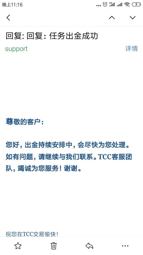4月份出金,至今没有到账,客服回复都是一样的冠冕堂皇,希望尽快到账,