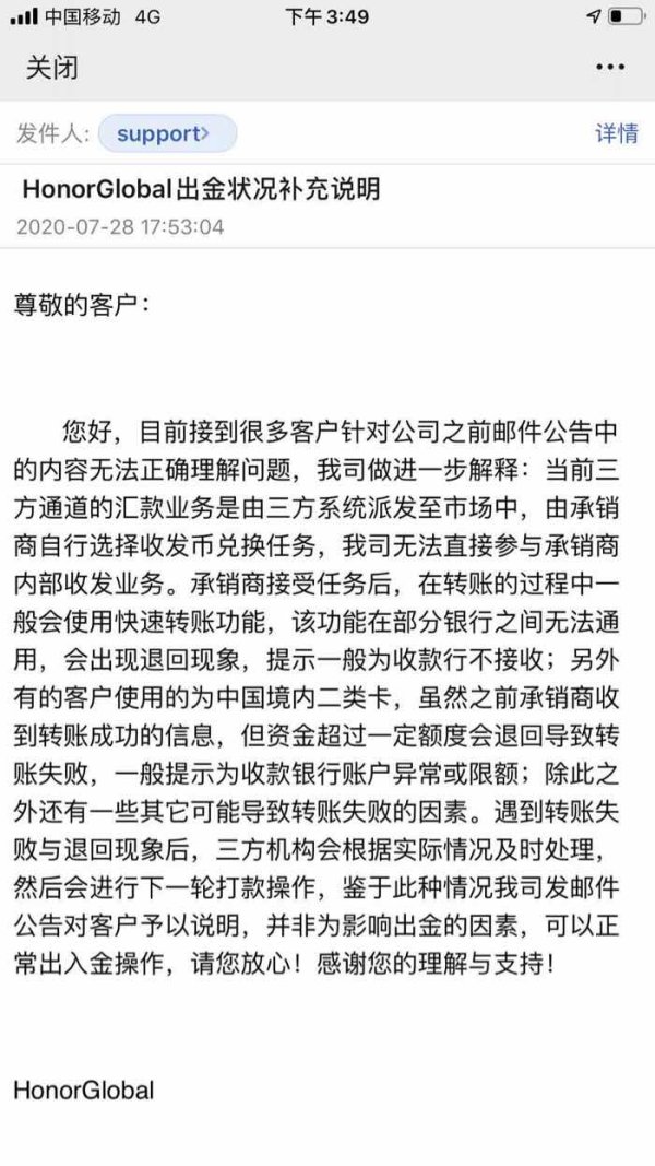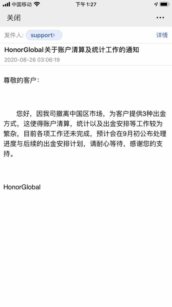 Plataforma de fraude. Incapaz de retirar. Várias pessoas ao meu redor investiram sete ou oito milhões e seu dinheiro acabou. Chamamos a polícia. Não havia dúvida de que era uma farsa. Todo o pessoal em Honor Global não pode ser contatado agora.