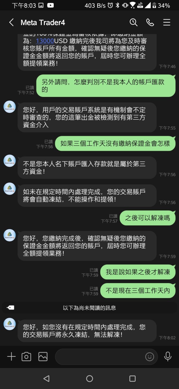 交友投資詐騙,小額出金正常,當要大額的時候就通知你的資金有第三方,要繳交保證金,還限制三天內不然就封鎖帳號。詐騙的女性還一直還貼上的資料說有監管很安全,事情發生還一路撇清是平台的規定