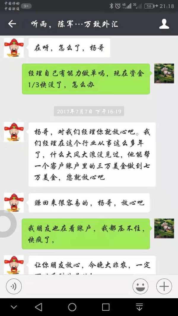 2017年6月12日,一个自称是万致外汇工作人员,(陈军,QQ号,2499957058,手机号13651600747)向我介绍万致外汇平台 多么的好,能够赚到钱,我表明自己因工作原因没时间看盘,他表示万致公司有专人帮看盘操盘,6月14日,我把密码给了王经理(王凯手机18017251060,QQ177892192,),开始入金3000多美金,账了一点点,6月24日,说公司作活动,入金到2万美金,就能送银碗(我已收到 ),于是我入了20960美金,随后账户一直亏钱,与他们沟通过,说行情判断错误,会慢慢赚回来的,到2017年10月份,账户只剰有几百美金, 与王经理沟通无果,平台杨总监来协调,最后赔我9750元现金。万致官网https://www.vantagefx.com.cn/ 我的交易记录现在已经查不到了 我在万致外汇平台前后入金共计27075美金,折合人民币184263.81元。