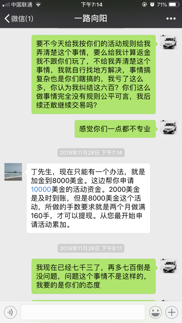 这个普罗汇,见过黑的,没有见过更黑的了。我在这个黑平台也就做了一个月时间,期间陆续入金8550美金,先是1000赠200,后来业务员说3000赠600更划算,他们的活动规则明明写着赠金可用于账户保证金,交易满手数就可以提现,还可以人工后台操控收回赠金强平账户订单的,这样的神操作。找他们业务员理论,解释自己打脸得厉害,不给退还。后来直接告诉我要升级参加8000赠2000活动才行,好吧没办法加钱吧,可是这个2000亏到剩下一毛不到,我刚又入了600,想着看准的方向,走一波就盈利填平了吧,他们监视客户账户,看单子要盈利了,就给我收回赠金强平单子?还每次都是刚入金就收回?果然够黑,什么都是他们说了算,自己定的规则,想怎么说就怎么说,想怎么干就怎么干,赤裸裸得欺诈抢夺,现在本金亏完,我还还欠了他们钱了?