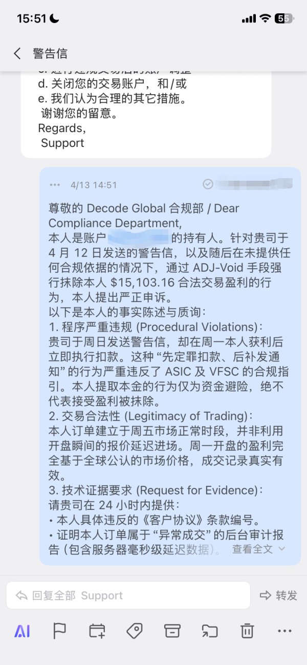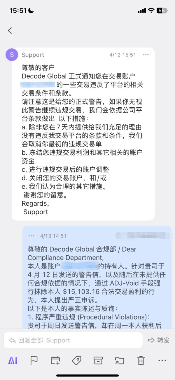 1. 违规行为: 本人在 Decode 平台交易,周一开盘获利后,平台在未提供任何证据、未进行任何沟通的情况下,通过后台 ADJ-Void 强行抹除本人 $15,103.16 的合法利润。 2. 事实陈述: • 本人持仓订单为周五正常建立,持仓过周末符合平台 2000 倍杠杆规则。 • 周一开盘获利完全基于市场公允报价,无任何套利或延迟操作。 • 平台于周日预发了一封没有任何具体条款的“警告信”,却在周一获利后立刻扣款,属于典型的定向收割盈利客户。 3. 维权经过: 本人已提取本金(428 刀),并多次通过邮件向平台合规部(support@decodefx.com)发起正式申诉,但平台截止目前拒不回复,拒不提供任何违规证据。 4. 诉求: 要求平台公开道歉,恢复本人 $15,103.16 的合法利润