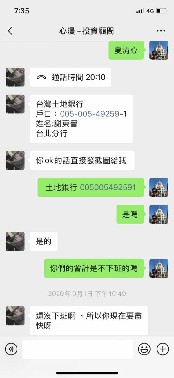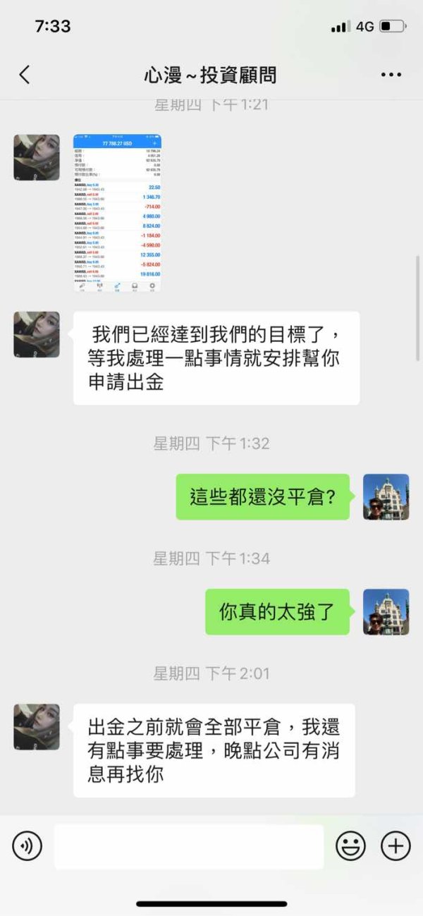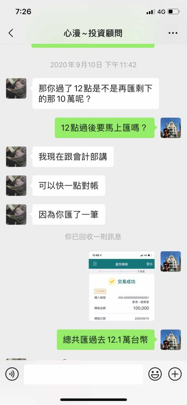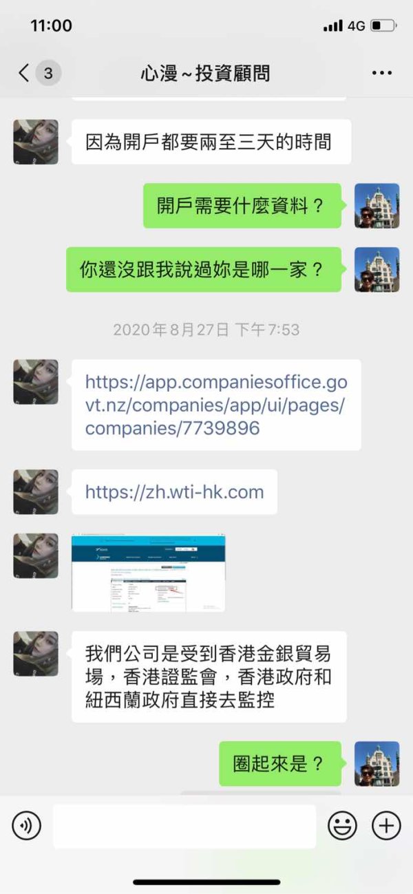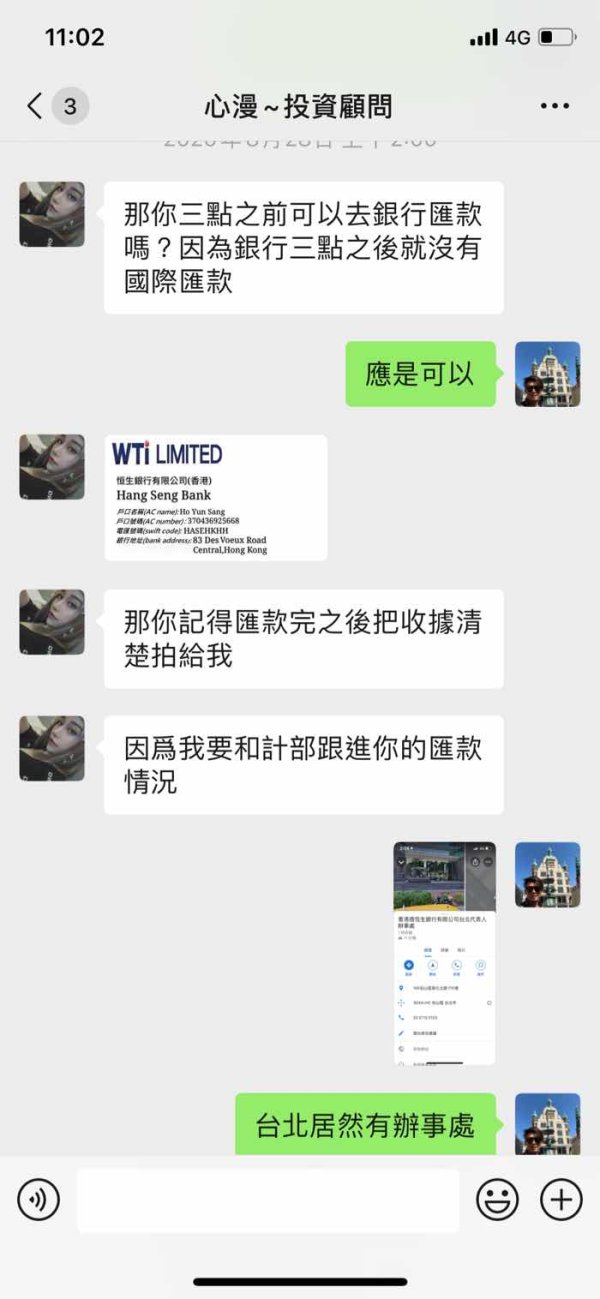 今年3-4月在網路上認識一個女生 後來加了微信 剛開始都是閒聊 後來我知道她在香港外匯公司(WTI-Limited hk)做投資相關工作 8月底聊到剛好那幾天有非農數據 我問她相關知識 後來她跟我說需要資金我覺得這個行情很適合你 8/28第一次入金1752.18美金(約5萬台幣)到香港恆生銀行的私人帳戶 戶名:Ho Yun Sang 她說為了方便給我一個台灣土地銀行帳戶 後面入金都是匯到台灣的土地銀行帳戶(戶名:謝東晉) 9/1匯5萬元台幣 9/4匯兩筆,分別是5萬元台幣,1萬8千元台幣 9/10共匯兩筆分別是10萬元台幣及2.1萬元 9/17通知我已經做完那一波大行情 她傳來操作的結果說已經達到我們的目標獲利部分是77788.27美金 但是還是未平倉 然後她說 她已經幫我申請出金, 出金之前就會全部平倉,晚點公司有消息再找你 9/17當天公司客服跟我說 因為裡面有她跟公司申請的信用 不能直接出金 要我補上入金4051美金才能平倉出金給我 我問過能否先出部分 公司回覆也是無法 目前狀態無法出金 我登入帳戶也顯示無效