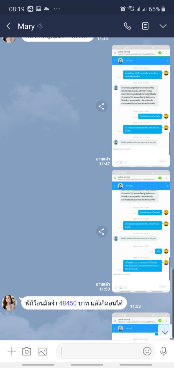 ผมได้รู้จักผู้หญิงคนหนึ่งผ่านทางออนไลน์ เขาได้ชวนเทรด forex ผมได้ลองเอาเงินเข้าพอร์ตและเทรดได้รวม 4,751 USD เมื่อผมจะถอนเงินกลับถอนเงินไม่ได้ ศูนย์บริการแจ้งให้จ่ายเงินเพิ่มเป็นค่ามัดจำ 30% ของยอดเงินคงเหลือ และอ้างว่าผมได้ฟอกเงิน ผมต้องการเงินของผมคืน ช่วยไกล่เกลี่ยให้ด้วยครับ