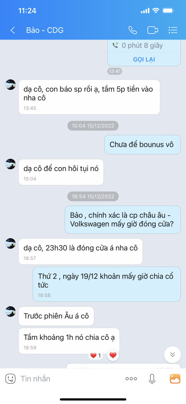 Tôi nạp tiền vào CDG từ ngày 9/12/2022 với tổng số tiền là 342.700.000₫ ( gần 15.000$) , số MT4 là 862384 , ngày 15/12/2022 Tôi mua 3.000 cổ phiếu Volkswagen để đến ngày 19/12/2022 nhận cổ tức (tiền cổ tức là 19,06 EURO một cổ phiếu , mua 3.000 cổ phiếu tiền cổ tức của Tôi khoản 61.000$) , nhưng đến ngày 19/12/2022 CDG không chi trả cổ tức cho Tôi (trong khi tất cả các sàn trên thế giới đều chi trả cổ tức Volkswagen vào sáng ngày 19/12/2022) sau đó đến 15g phiên Âu mở cửa giá cổ phiếu Volkswagen rớt thê thảm làm tài khoản của Tôi bị cháy(tài khoản sau khi cháy Số dư lúc này tự động điều chỉnh về 0) rồi đến 22g CDG email cho Tôi và thông báo tiền cổ tức sẽ chi trả vào ngày 9/1/2023 .