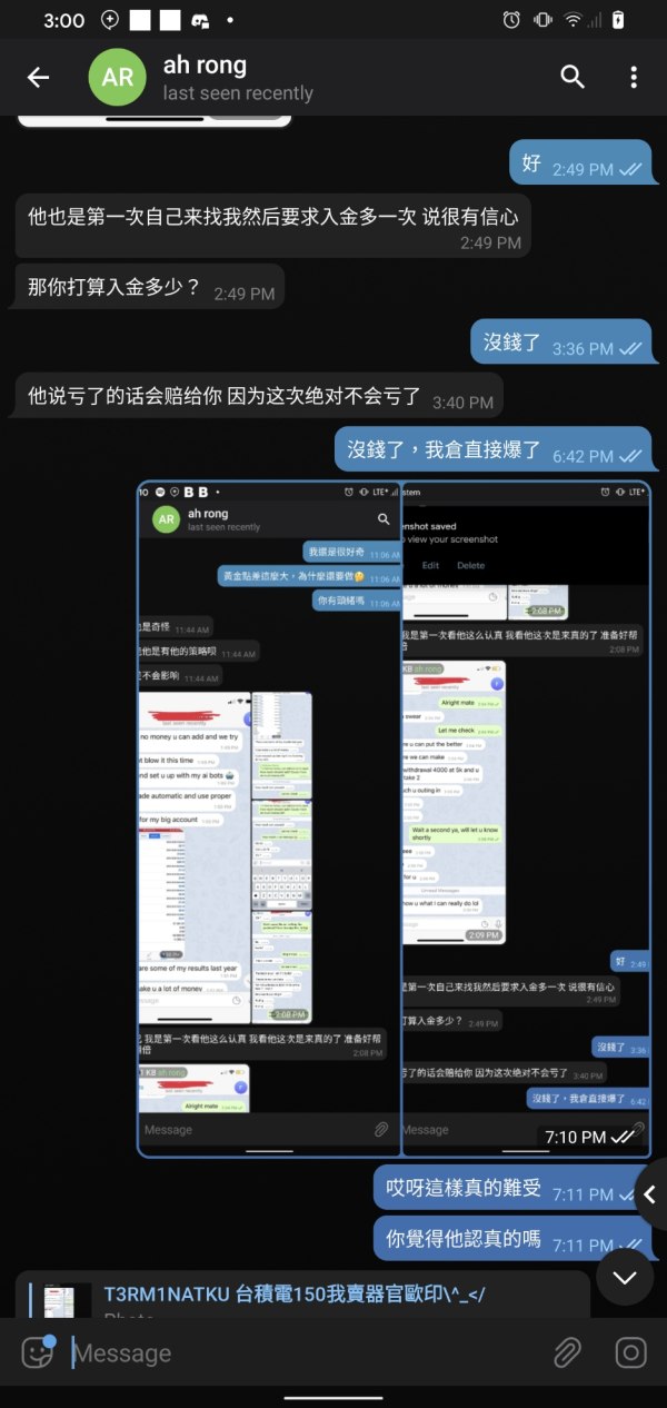 已爆倉一次又讓我再入金 說這次認真的 賠錢會賠結果又再爆一次人直接溜了估計這經理跟那操盤的同夥後續經理卸責到是很熟練