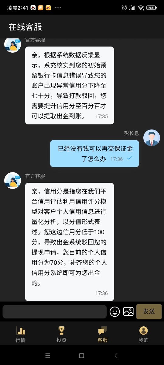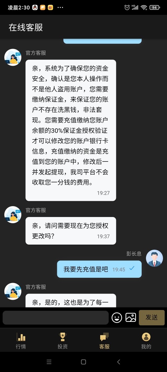 看这个人的微信加入,第一轮因为操作失误补了5万,第二轮因跟另一个人操作盈利不一样为了提现又补了 她万,最后提现提示银行卡号错被退回需要交30%保证金才可以修改,交了15万后发起提现又说因为修改信息信用分不足需要再次充值30%,意识到被骗。现寻求帮助,谢谢!