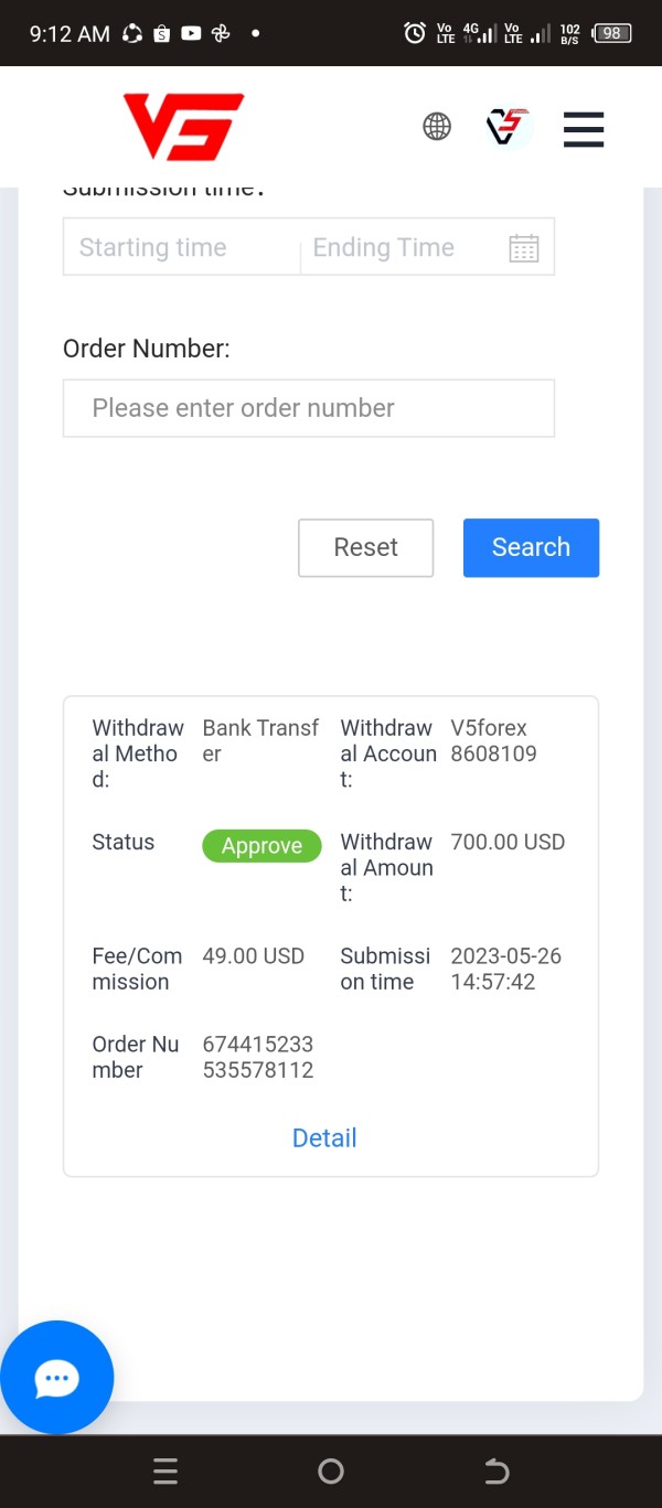I'm a trader one of the member of v5 forex global,why did not receive my first withdraw amount of 700dollars on may 26,until now June 21,2023.please help my withdrawal account.my account number is 8608109
