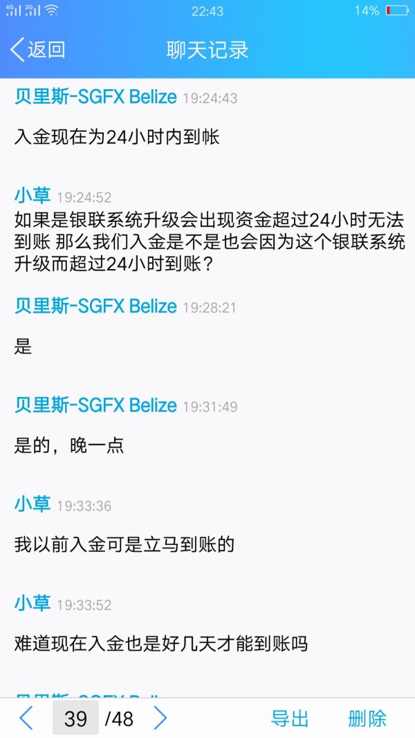 2018年9月13日下午18.46分申请出金 19.06分审核通过 然后到2018年9月14日晚上22.46分还没出金到账 客服一直找各种理由
