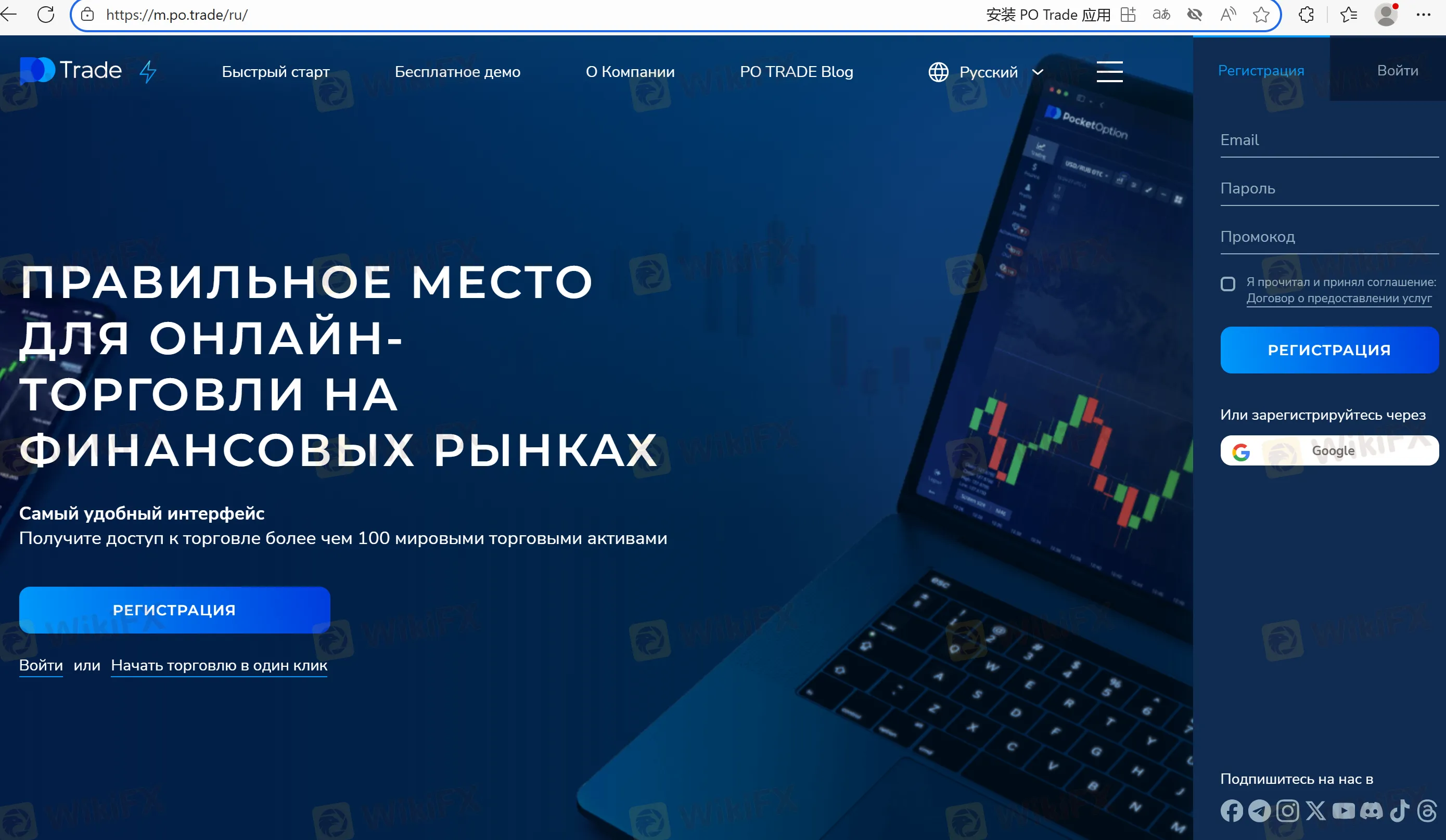 Po.Trade предлагает быстрые бинарные сделки, копитрейдинг и турниры. Интерфейс удобный, демо-доступ мгновенный, но отсутствие лицензии делает платформу крайне рискованной.