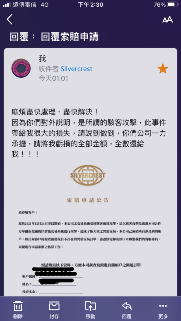 12/29 silvercrest 交易商發出電郵,說 可以填寫申請索賠,但!填寫完畢,回傳後竟然收到郵件退回通知⋯⋯silvercrest 交易商是真的有心要賠償嗎?????