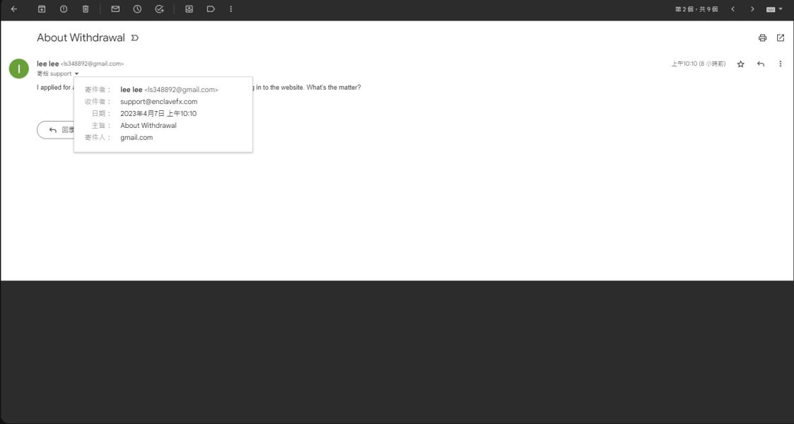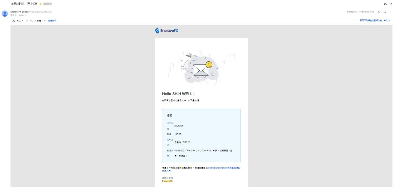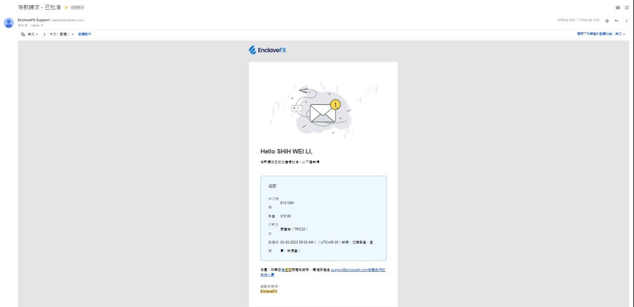 本人於2023/03/28開設EnclaveFX交易帳戶,於2023/03/28透過USDT-TRC20入金130 USD(如附圖),並於2023/03/30透過USDT-TRC20入金370 USD(如附圖),2023/04/03透過USDT-TRC20出金1150 USD(如附圖),一直到今天2023/04/07都沒有處理出金,寫信給客服沒有任何回復(如附圖),後台開票也沒有任何回應(如附圖)