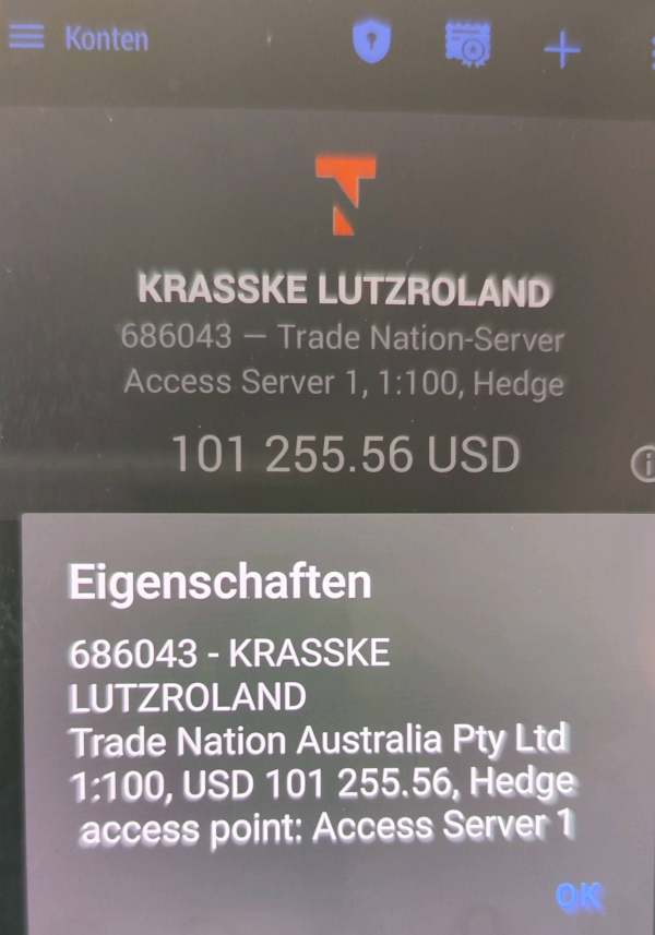 Ich kann mich auf der offiziellen Trade Nation Seite nicht mit meinen Daten einloggen.Scheinbar existiert ein Klon ,der zum Betrug genutzt wird.Trade Nation benutzt zum einloggen die Email ,während "mein Anbieter" eine Kundennummer suggeriert.
