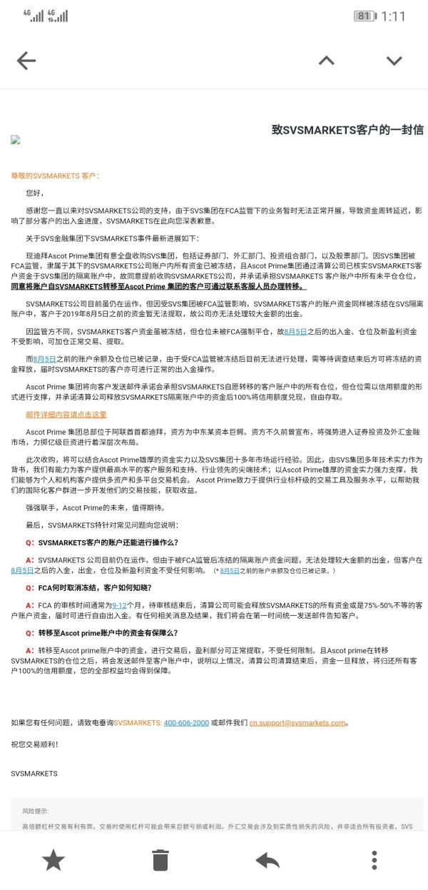 svs倒闭后,中国区工作人员,以及平台给客户发邮件说进行资金转移,说由Ascot prime接管塞舌尔监管下的业务,开始还能正常交易,就是问题不断,点差涨了,而且经常性掉线,现在出金都快一个月了,无人受理,也没人回复邮件,联系不到平台任何工作人员