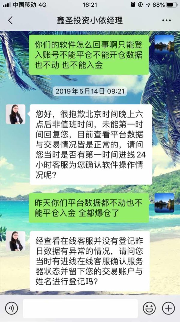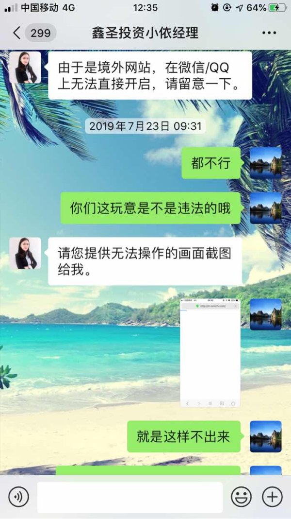 我跟随鑫圣平台的分析师做单,在跟随做单过程中问题不断,APP软件问题,网络问题,分析师盈利一点就出,亏损一直扛着(故意)等问题。和平台理论平台直接封号不给说法,就说此账号以及交由法务部门处理,但是一直也没有处理。后我报警处理,直到最近看到有金融人士发布消息说鑫圣投资平台最近一直在跟换网站IP和办公地点,后我通过调查发现鑫圣投资平台已经停止经营,更换全新的APP叫做期货黄金宝(ios版),请大家注意这是个骗子, 骗完就换马甲继续骗。