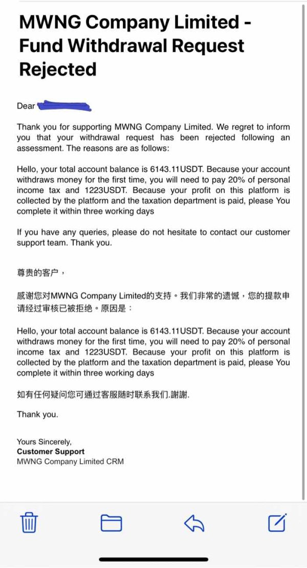 MWNGเป็นนายหน้าฉ้อโกง ฉันยื่นขอถอนเงินหลายครั้ง แต่พวกเขาขอให้ฉันจ่ายภาษี 20% และ 1223 $ พวกเขาควรได้รับการตัดสินโดยกฎหมายเพื่อหลีกเลี่ยงไม่ให้มีคนโกงมากขึ้น