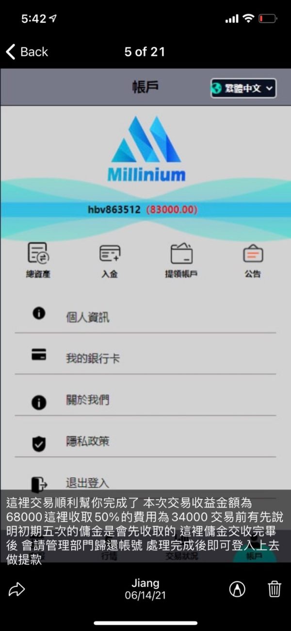 一開始開頭都是 人在國外不能管理帳號要有人幫忙管理,5天後就說有甚麼是不能繼續就會跑到這個所謂的姜專員這邊,我已經試了3個人了,最後結果是一 樣的。百試不厭從要請人幫忙管理的雇主那邊開始,如果你不知道過程你就會被他前幾天的收益給騙走,如果知道過程的話,雇主全部都會閉嘴而且有點想說 你怎麼知道的感覺,開始逃避,已獨不回。每個雇主說的話有點像報告詞,內容都大同小異,所以看到這個人千萬不要被騙了。 要出金平台會千百種理由,然後這個姜專員又會幫你協調幫你處理,看似很有責任心的感覺,實際上是越騙越多所以給大家警惕 這個就是所謂的 姜 專 員 死不認錯
