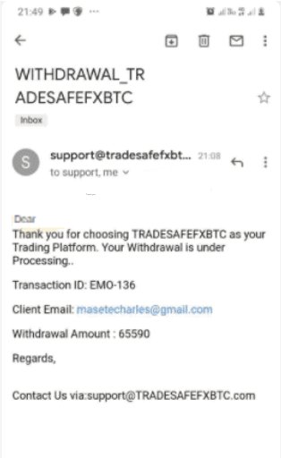 I have been scammed by tradesafefxbtc company ,I first deposited ZAR3000 and after few days they asked me to deposit ZAR8000 for software to secure my account after all my account was $65590 and they asked me to deposit ZAR20000 in order to receive my profit.if i dont deposit they wont let me withdraw!